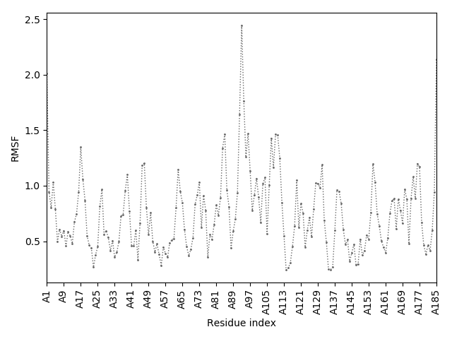 (the most aggregation prone model in blue, input in red) and RMSF plot which shows the extent of residue fluctuations in Angstroms (predicted by CABS-flex).