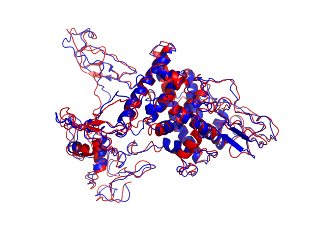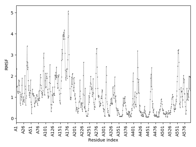 (the most aggregation prone model in blue, input in red) and RMSF plot which shows the extent of residue fluctuations in Angstroms (predicted by CABS-flex).