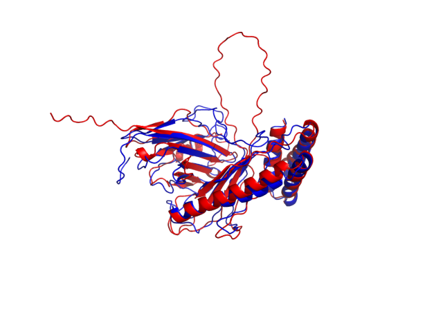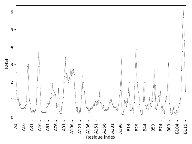 (the most aggregation prone model in blue, input in red) and RMSF plot which shows the extent of residue fluctuations in Angstroms (predicted by CABS-flex).