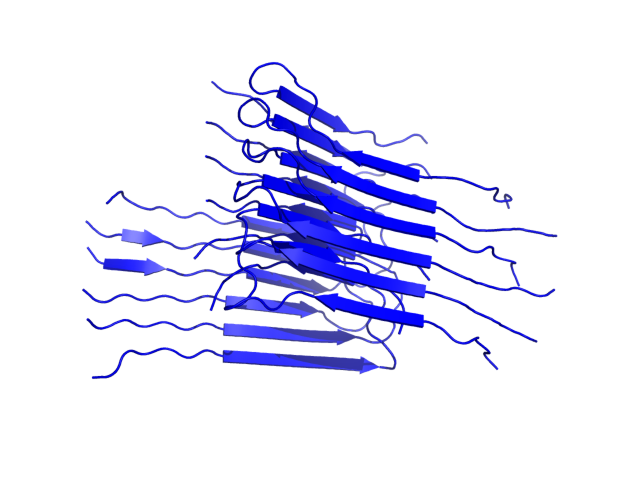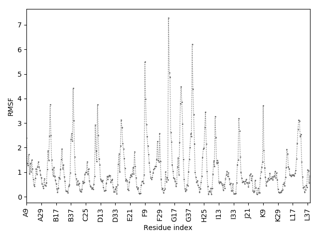 (the most aggregation prone model in blue, input in red) and RMSF plot which shows the extent of residue fluctuations in Angstroms (predicted by CABS-flex).