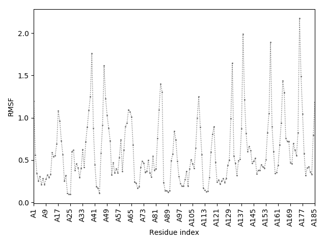 (the most aggregation prone model in blue, input in red) and RMSF plot which shows the extent of residue fluctuations in Angstroms (predicted by CABS-flex).